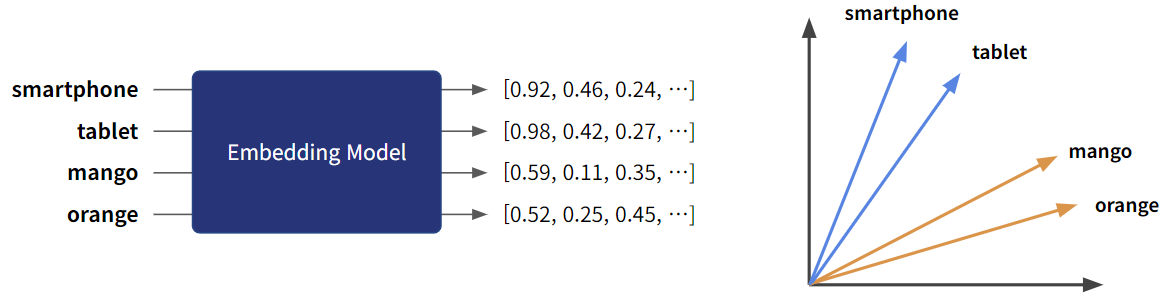 예를 들어, 같은 이미지 데이터라도 이미지의 색감을 기준으로 임베딩할 수도 있으며 이미지에 포함된 오브젝트를 기준으로 임베딩할 수도 있다. 전자로 임베딩한 경우, 붉은 색 이미지를 쿼리하면 붉은 계열의 이미지를 검색할 것이며 후자의 경우 쿼리 이미지 내에 고양이가 있다면 고양이가 포함된 이미지를 검색할 것이다. 이렇게 임베딩 모델은 사용자가 지정한 뱡향으로 데이터를 벡터 공간에 배치한다. 임베딩에는 데이터의 의미를 보존할 수 있는 함수나 알고리즘, 또는 사전 학습된(pre-trained) 임베딩 모델을 사용한다.