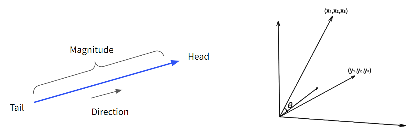 벡터는 길이와 방향을 가진 수학적 객체를 말한다. 이는 $n$차원 벡터 공간에서의 위치를 나타내며, 이 위치는 길이가 $n$인 1차원의 숫자 배열로 표현된다. 데이터 과학에서의 벡터는, 이러한 정의에서 나아가 데이터의 특성이나 속성을 나타내는 숫자의 배열로 이해된다. 복잡한 데이터일수록 더 높은 차원의 벡터로 표현된다. 기계학습이나 인공지능 모델을 구축하기 위해서는 먼저 데이터를 모델이 이해할 수 있는 동일한 차원의 벡터로 변환해야 한다. 텍스트, 이미지, 음성과 같은 비정현 데이터 또한 임베딩(embedding)을 통해 벡터로 변환될 수 있다.