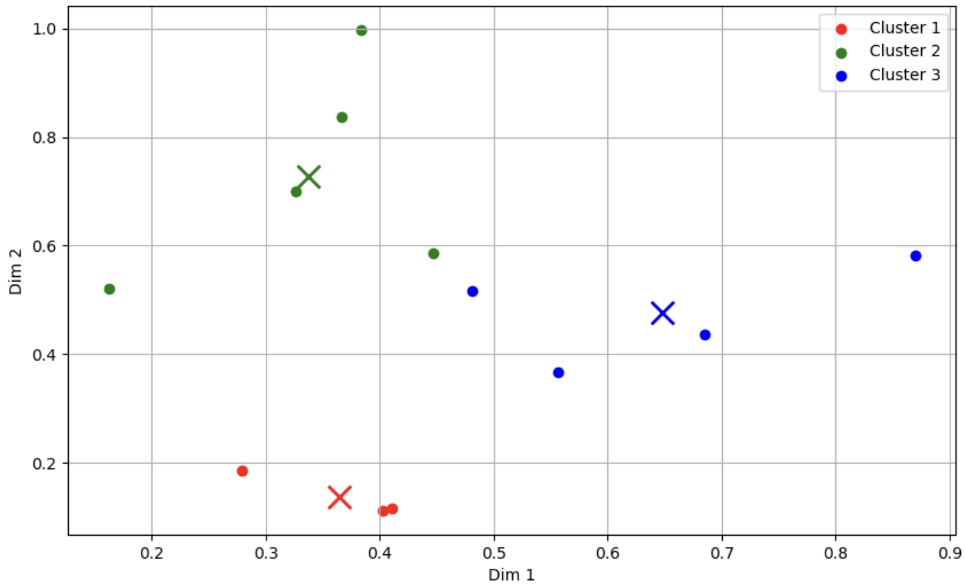 이 예제에선 2차원으로 구성된 12개의 간단한 데이터셋을 이용하였고, k-means 클러스터링으로 3개의 클러스터를 생성하였다. 클러스터링 결과를 다음과 같이 시각화할 수 있다.
