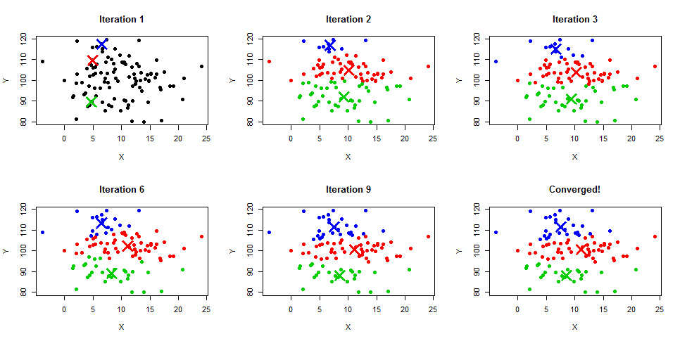 - 이 작업을 중심점의 변화가 미비해지는 어떤 기준에 이를 때까지 충분히 반복한다.