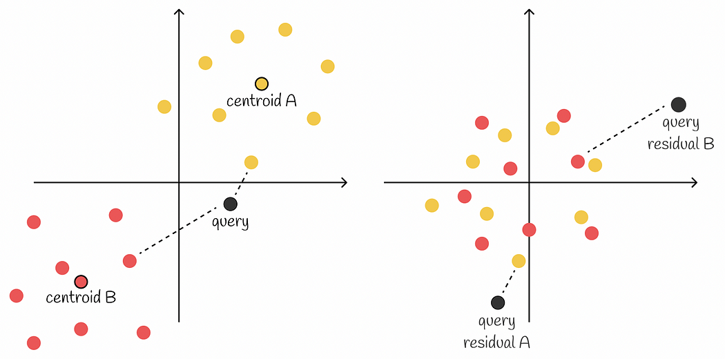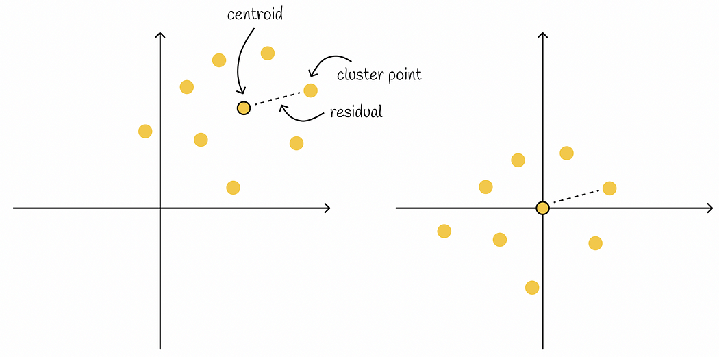 잔차 인코딩을 적용하면, 더 적은 수의 숫자로 데이터를 표현할 수 있다는 개념을 한 번 더 짚고 넘어가보자. 동일한 벡터 공간에서, 서로 다른 클러스터의 데이터들은 같은 좌표값을 가질 수 없다. 하지만, 중심점과의 거리는 같을 수 있으므로 잔차는 같은 값을 가질 수 있다. 잔차의 값이 같더라도, 해당 벡터가 다른 클러스터에 속한다는 정보가 있으므로 두 데이터를 구분할 수 있다.