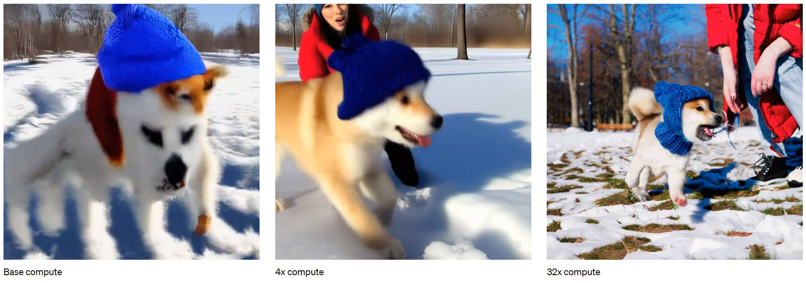 In this work, we find that diffusion transformers scale effectively as video models as well. Below, we show a comparison of video samples with fixed seeds and inputs as training progresses. Sample quality improves markedly as training compute increases.