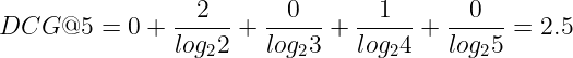 - 위 표에서 DCG를 계산하면 다음과 같음