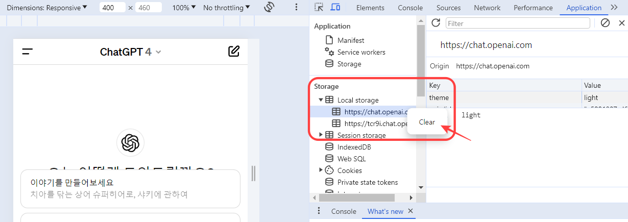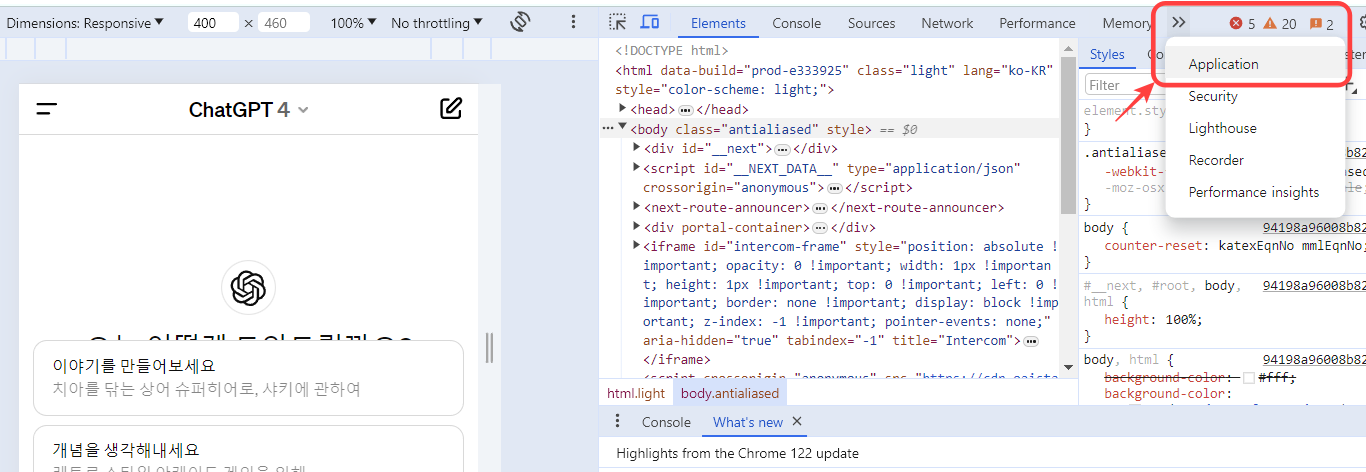 ChatGPT에서 간혹 질문을 해도 답변이 생성되지 않고 멈춰있을 때가 있다. 이 때는 일단, ChatGPT 화면에서 F12 키를 눌러 개발자도구 창에 진입한 후, 상단 메뉴바 '>>(더보기)' 버튼을 눌러 'Application' 메뉴를 클릭한다(크롬 브라우저 기준).