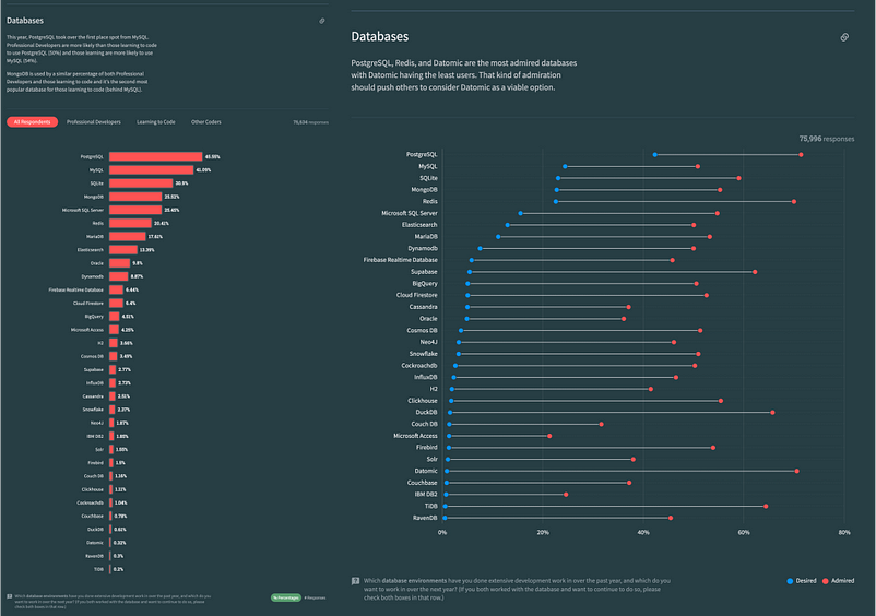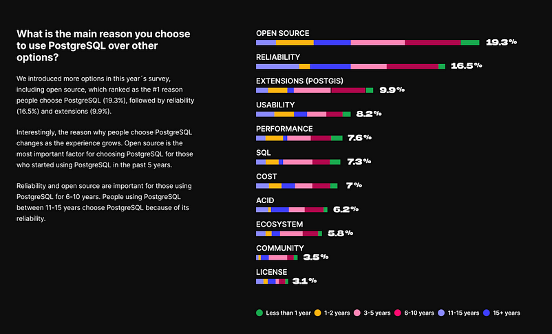 이러한 논리가 유지된다면, PostgreSQL 생태계는 눈덩이처럼 커지면서 장점을 쌓아가 몇 년 안에 서버 OS에서 Linux 커널의 지위를 반영하는 독점이 가능할 것이다. 개발자 설문조사와 데이터베이스 트렌드 보고서에서 이러한 추세를 확인할 수 있다.