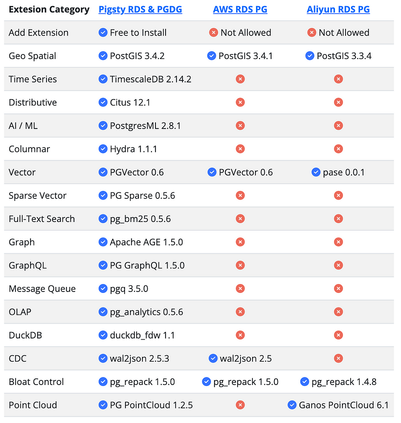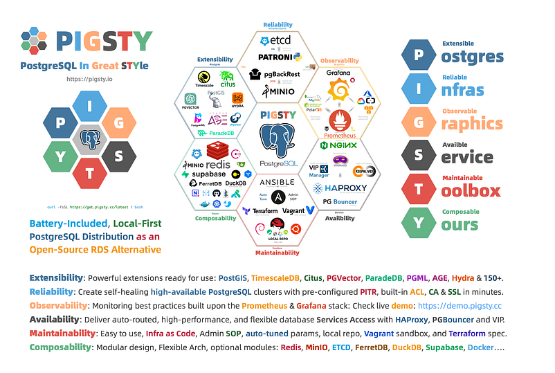 그래서, 필자는 RDS에 대한 오픈 소스 대안 제품으로 배터리가 포함된(battery-included)* 로컬 우선(local-first)** PostgreSQL 배포판 Pigsty를 만들었으며, 이는 PostgreSQL 생태계를 확장하는 집단적 힘을 활용하고 프로덕션급 데이터베이스 서비스에 대한 액세스를 민주화하는 것을 목표로 한다.