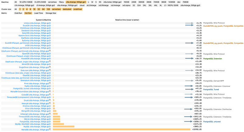 순수 OLAP에 중점을 두고 분석 성능을 극한까지 끌어올린 DuckDB는, 학문적 용도에 초점을 맞춘 비공개 소스 데이터베이스 Umbra를 제외하면 실용적인 OLAP 성능에서 가장 빠르다(x3.2). PG의 확장 기능은 아니지만, PostgreSQL은 임베디드 파일 데이터베이스인 DuckDB의 향상된 분석 성능을 DuckDB FDW 및 pg_quack과 같은 프로젝트를 통해 충분히 활용할 수 있다.
