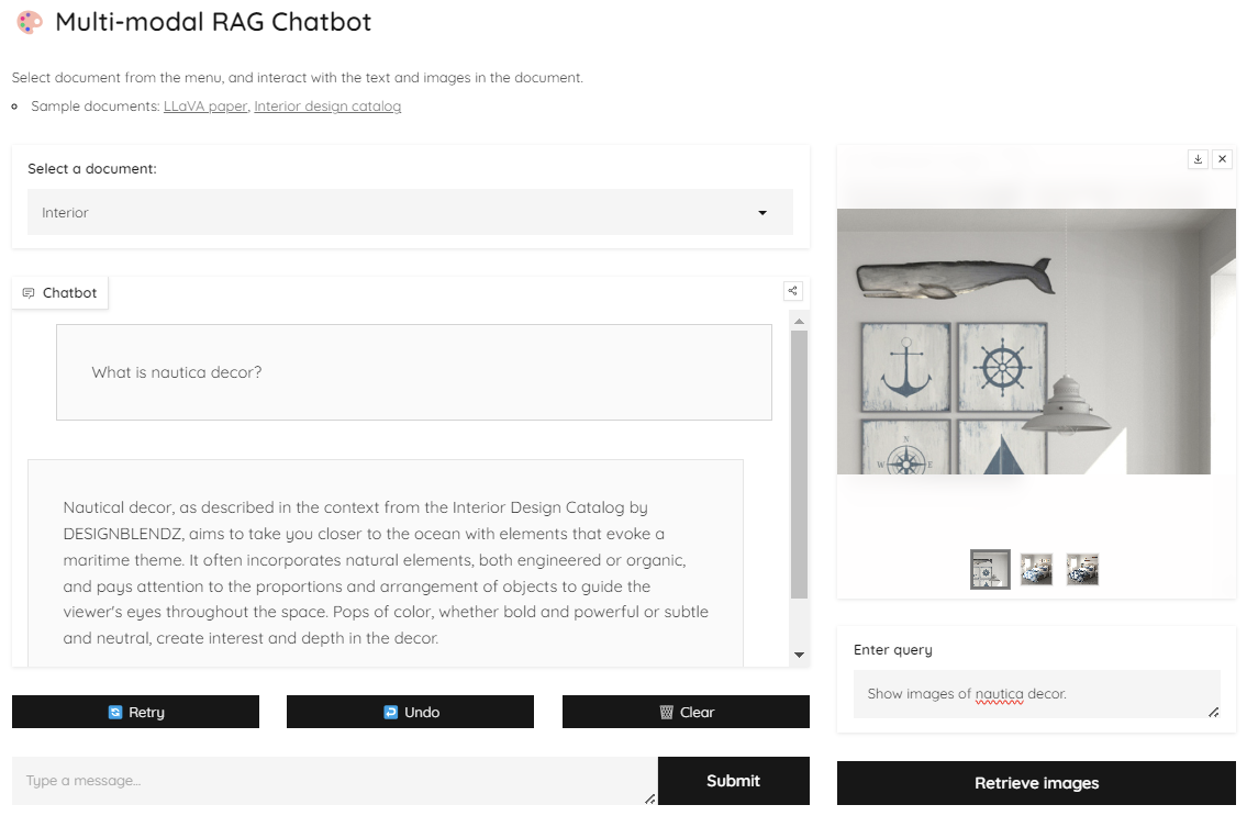 - 우측의 이미지 검색 모듈에 'Show images of nautica decor.'라는 질의를 입력하면, nautica decor에 대한 이미지가 잘 출력되는 것을 확인할 수 있습니다.'