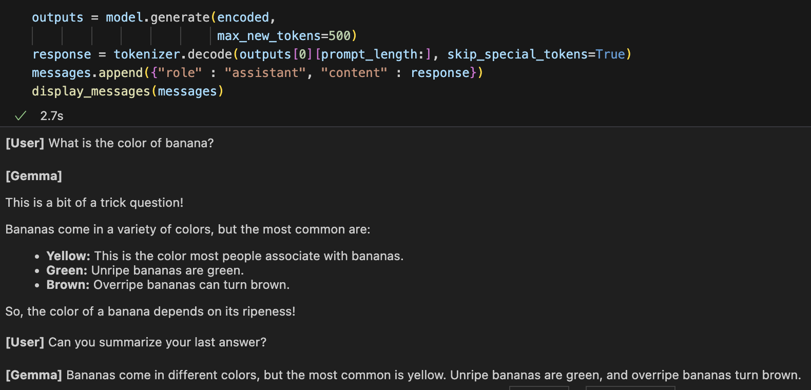 아래와 같이 답변이 잘 생성되는 것을 볼 수 있습니다. Gemma 모델은 아직 한국어 지원을 하지 않기 때문에 지원하는 언어로 질문을 해야 합니다.