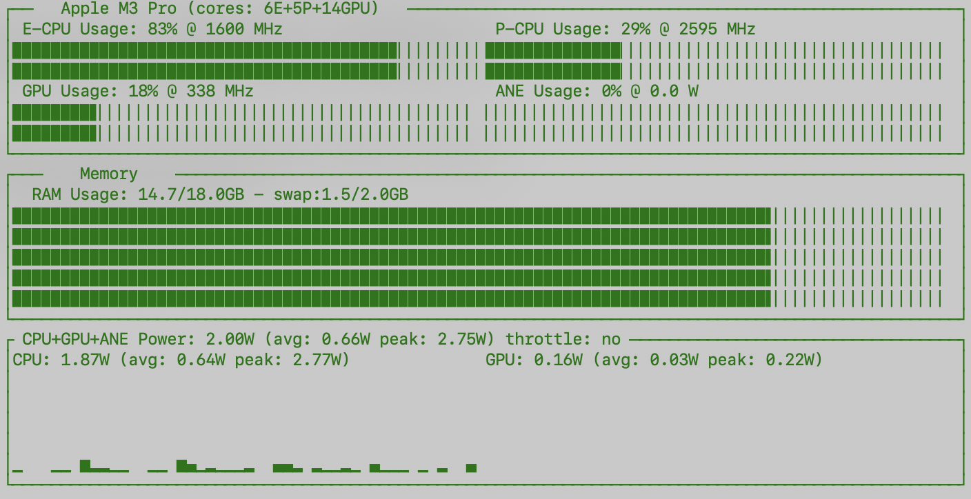 참고로, asitop과 같은 모듈을 이용해 Mac에서 LLM을 운용할 때 메모리 사용량을 실시간으로 체크할 수 있습니다. 저의 환경에서는 확인 결과 10GB 정도의 메모리를 차지합니다. 작은 모델이라고 해도 메모리 사용량이 만만치 않습니다. 어떻게 LLM 운용을 더 최적할 수 있을 지에 대해서도 계속 연구해보아야습니다.