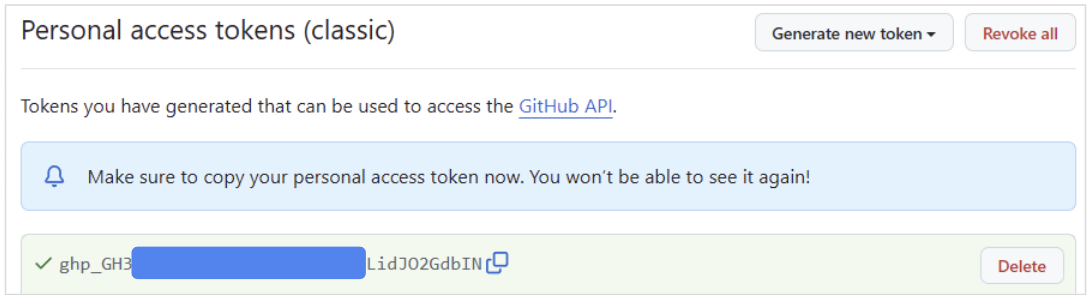 Generate token을 클릭하면 토큰이 발급됩니다. 이 토큰은 생성 시 한 번만 보여지므로 곧바로 별도의 공간에 메모나 저장해두어야 합니다.