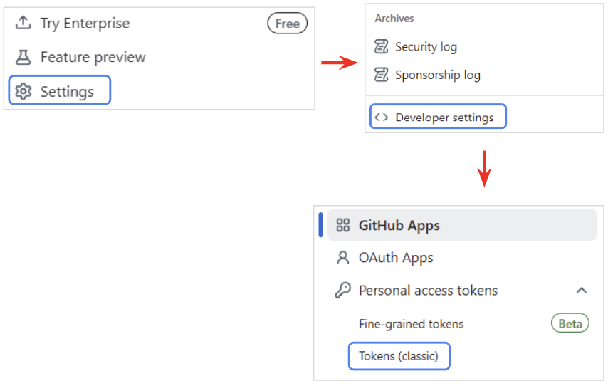 먼저, 인증을 위한 Git 토큰을 발급받아야 합니다. 로그인 후 프로필 > Settings > Developer settings > Personal access tokens > Tokens (classic) 메뉴로 진입합니다.