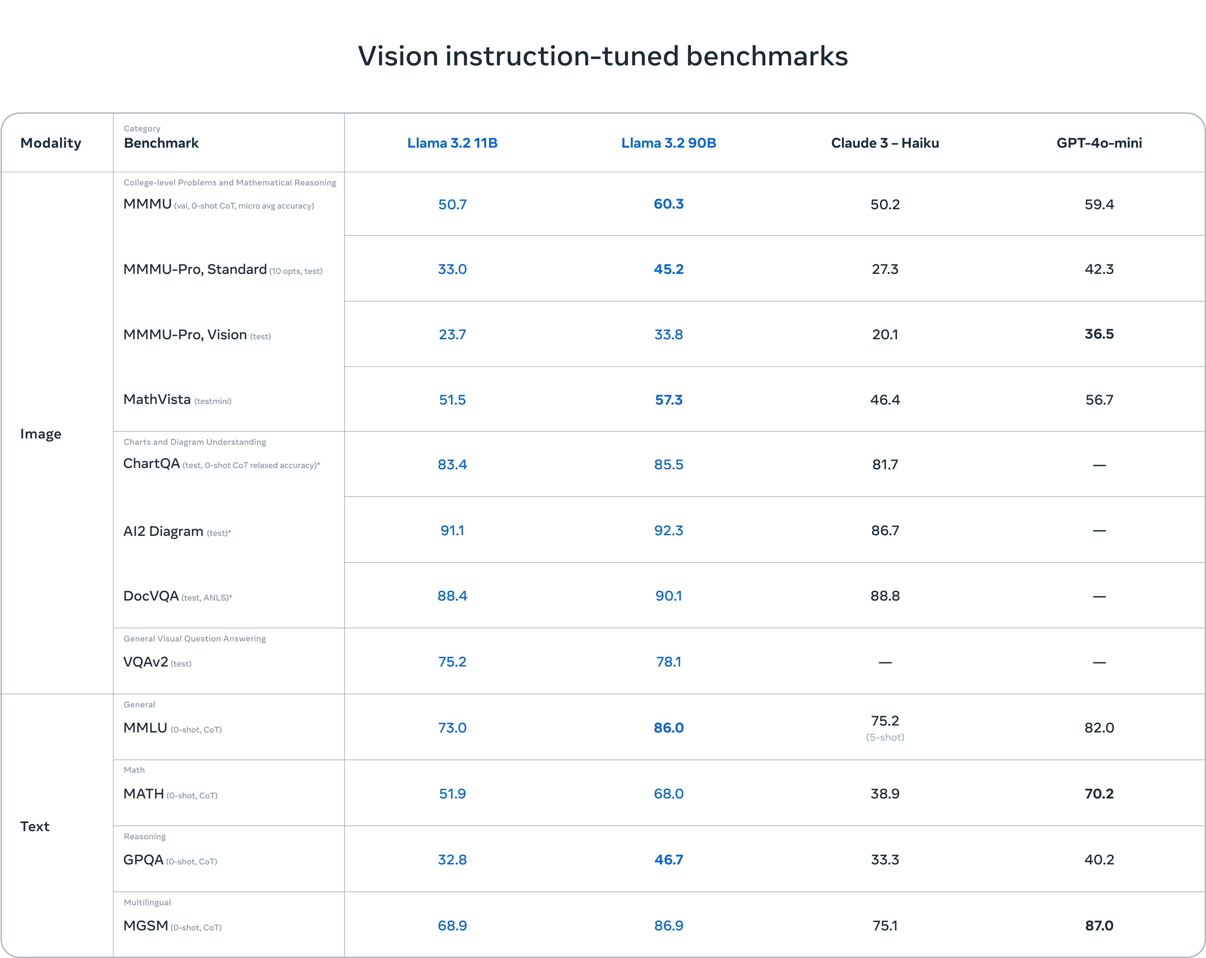 - Llama 3.2 비전 모델은 이미지 인식과 시각적 이해 작업에서 Claude 3 Haiku 및 GPT4o-mini와 같은 주요 모델들과 경쟁할 만한 성능을 보임.