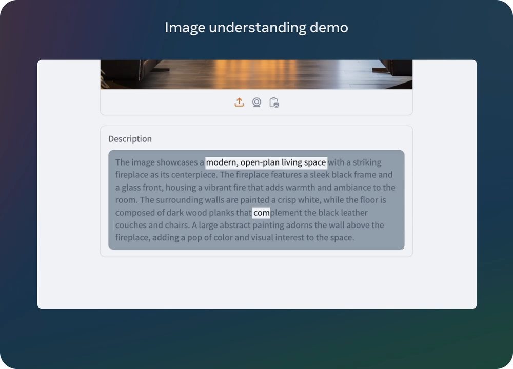 - 11B와 90B 모델은 이미지와 언어 사이의 간극을 메우며, 이미지에서 세부 정보를 추출하고 상황을 이해해 짧은 설명(캡션)을 작성할 수 있음.
