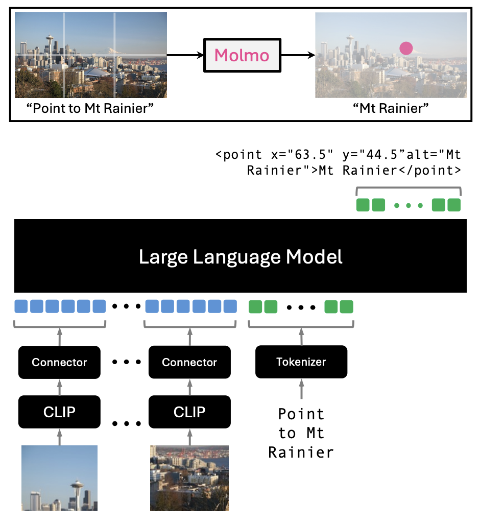 Molmo는 독립적으로 사전 학습된 비전 인코더와 언어 모델을 사용하며, 두 단계로 구성된 단순한 학습 과정을 거침: