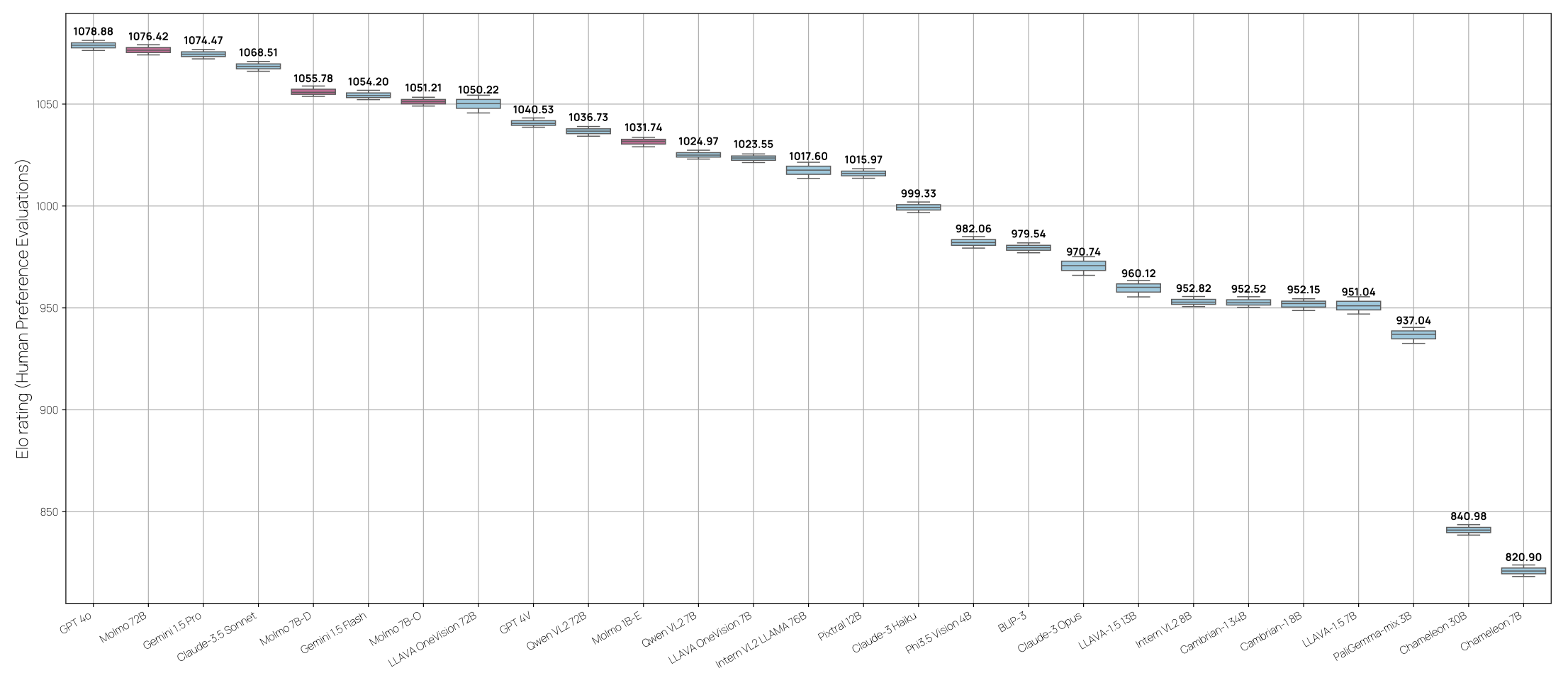 - OLMo-7B-1024 및 Qwen2 7B 기반 모델들은 학술 벤치마크와 Elo 순위에서 GPT-4V와 GPT-4o 사이의 성능을 기록함.